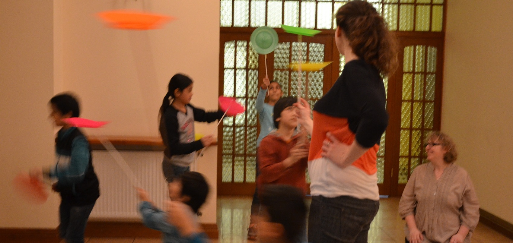 Następnie rozpoczęły się zajęcia które okazały się punktem kulminacyjnym tamtego popołudnia. Pani Monika uczyła dzieci sztuczek cyrkowych. Wszystkie maluchy, starsze i młodsze, bawiły się wyśmienicie. Hałasu było co nie miara, nawet wolontariusze brali udział w ćwiczeniach.