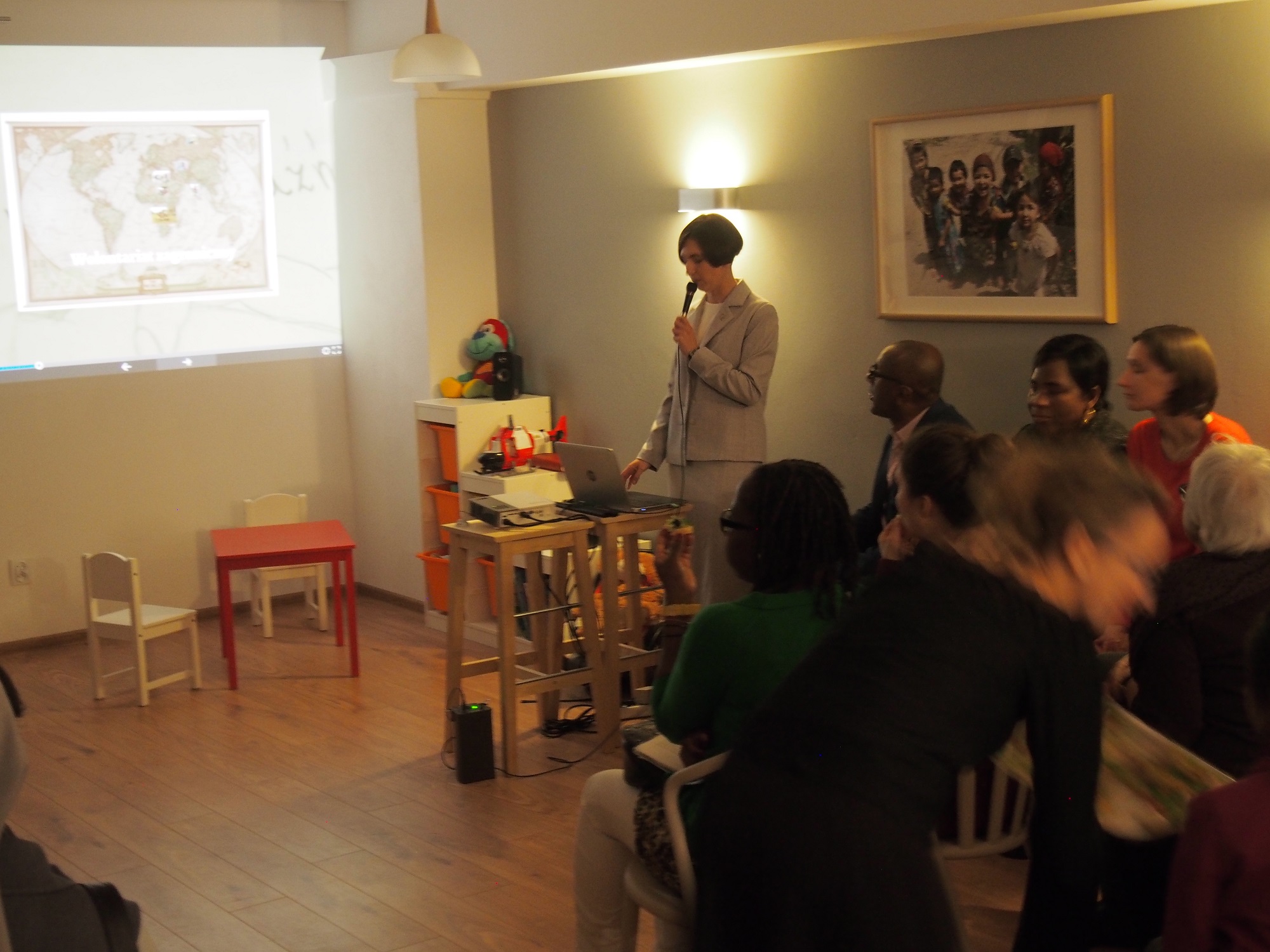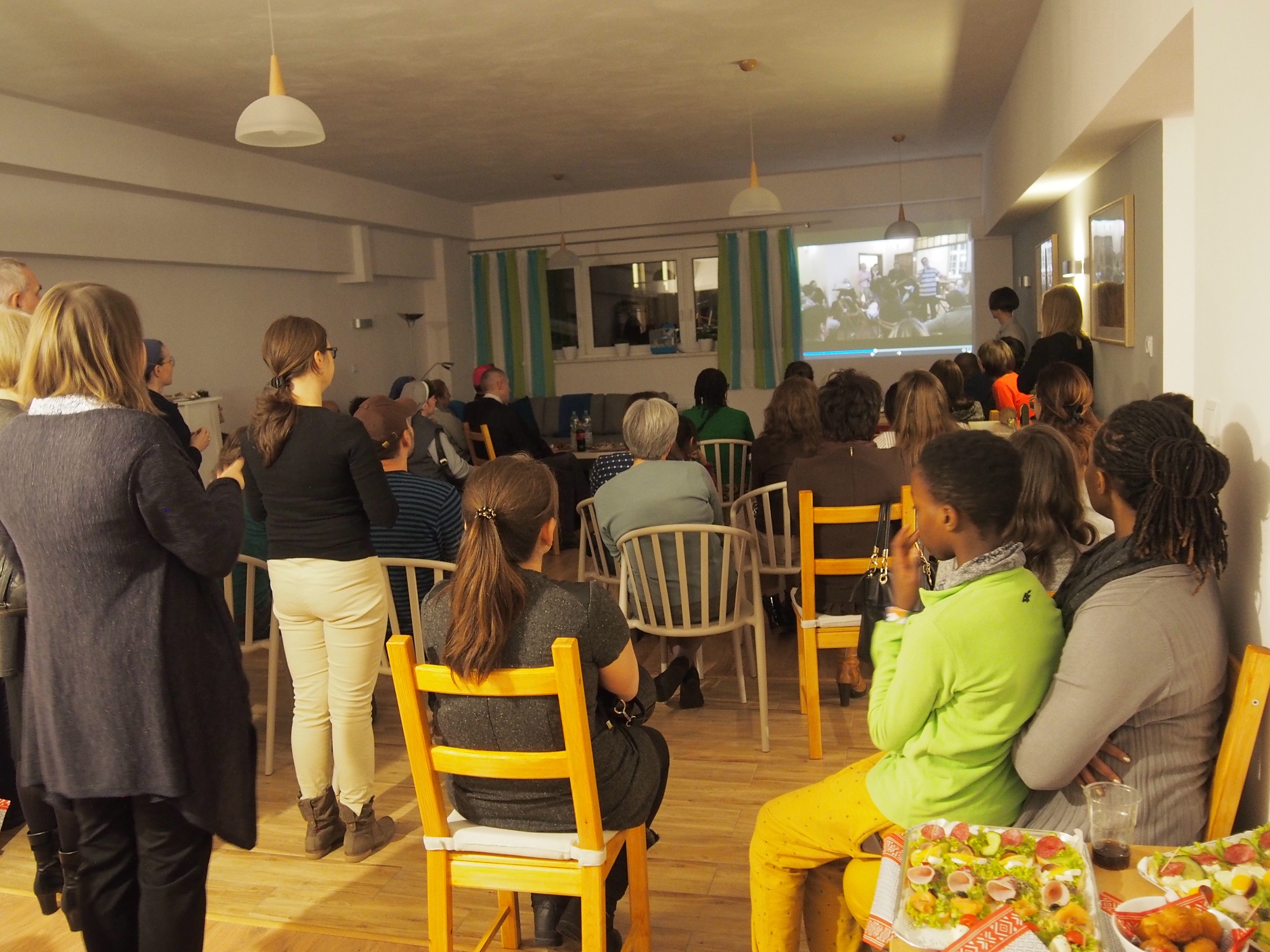Naprzeciwko kuchni znajdują się drzwi, za nimi czeka klasa. Pomieszczenie specjalnie pomyślane jako miejsce do nauki języka, z możliwością projekcji filmu na ścianie, ma służyć chcącym zgłębiać tajniki naszego ojczystego języka.