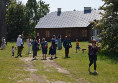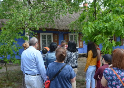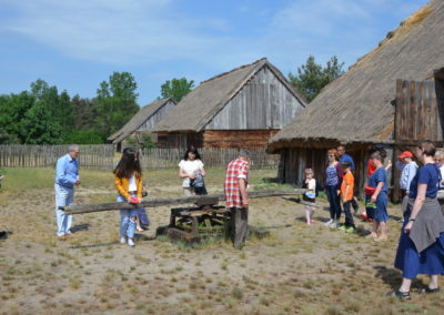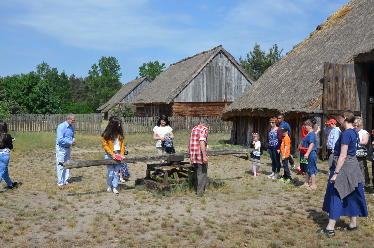 Naszą wyprawę rozpoczęliśmy od Łowickiego Parku Etnograficznego, czyli Skansenu w Maurzycach. Znajduje się tam rekonstrukcja łowickiej wsi z XIX w. i początku XX w. Wędrowaliśmy wśród stuletnich i jeszcze starszych gospodarstw oraz przydrożnych kapliczek. Natrafiliśmy także na karczmę, młyn, szkołę i kościół. Mogliśmy zajrzeć do dawnych domów i budynków gospodarczych, a także do szkoły i kościoła, wyobrażając sobie, jak wyglądało życie w tamtych czasach. Nasi przewodnicy – Pani Maria Bryzgalska i Pan Krzysztof Holewiński – opowiadali nam w języku angielskim i rosyjskim o codziennym życiu i obyczajach mieszkańców wsi łowickiej.