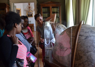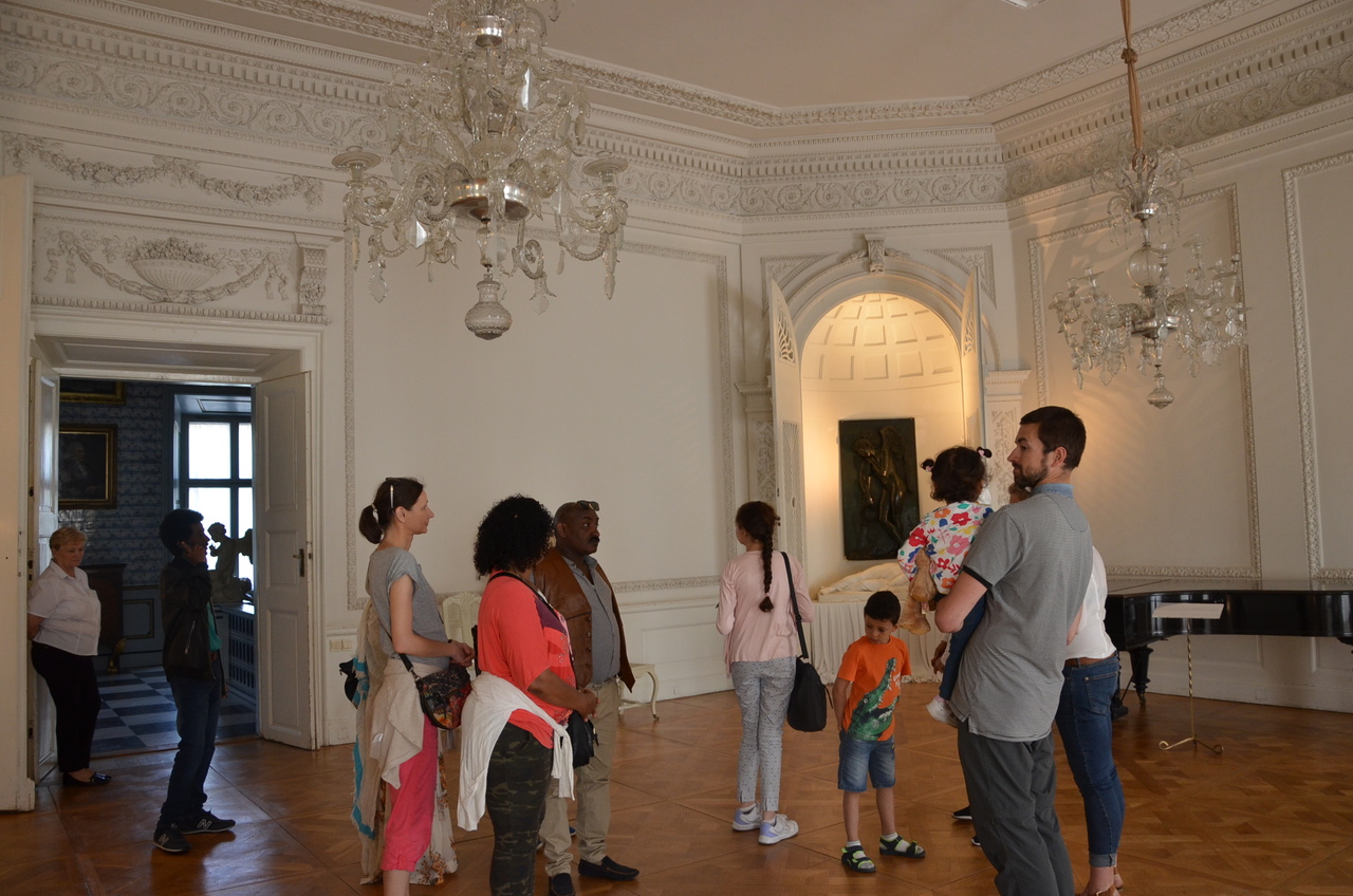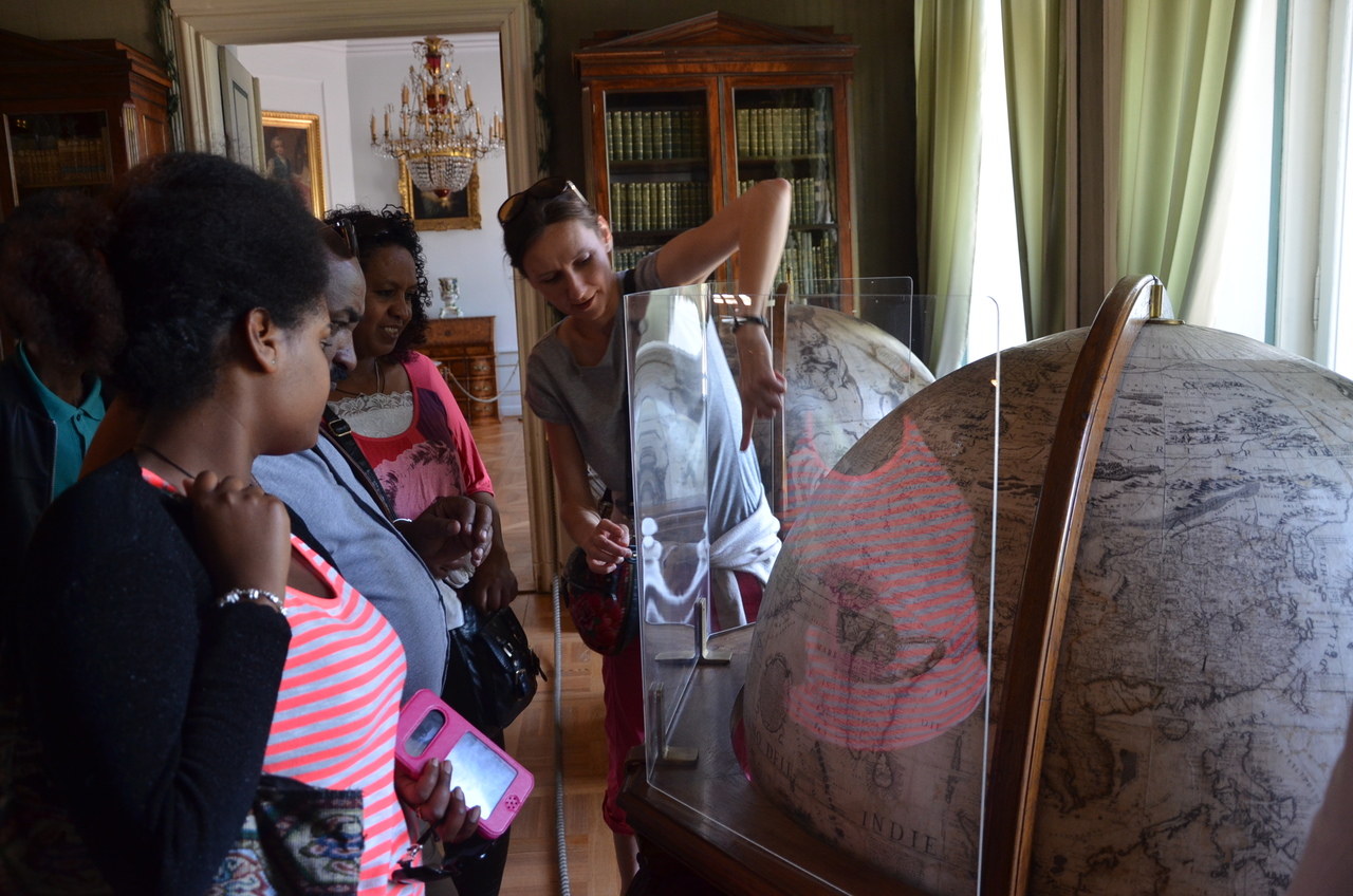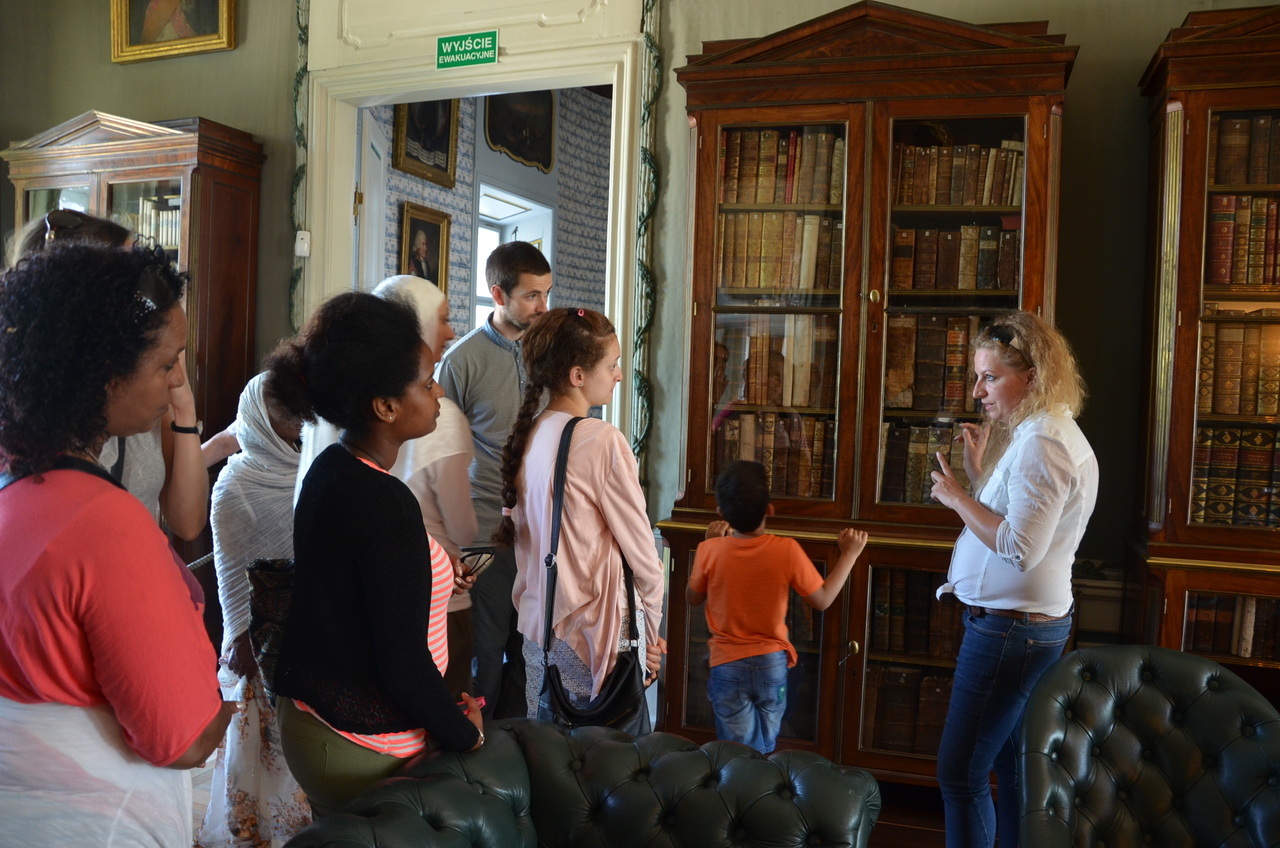 Następnie wyruszyliśmy do Nieborowa, gdzie przenieśliśmy się na książęce komnaty Pałacu rodziny Radziwiłłów z początku XVIII w. Mogliśmy tam obejrzeć piękne antyczne meble i inne zabytkowe przedmioty, w które wyposażony jest pałac – porcelany, szkła, tkaniny, stare książki, a także globus przedstawiający świat tamtych czasów. Szukaliśmy na nim miejsc, gdzie znajdują się kraje, z których pochodzimy – jak Abisynia, na terenie której leży współczesna Etiopia i Erytrea. Wielką popularnością w naszej grupie cieszył się także szezlong, który widzieliśmy w jednaj z komnat Księżnej Heleny. Wielu z nas miało nieskrywaną ochotę odpocząć sobie w tym miejscu.
