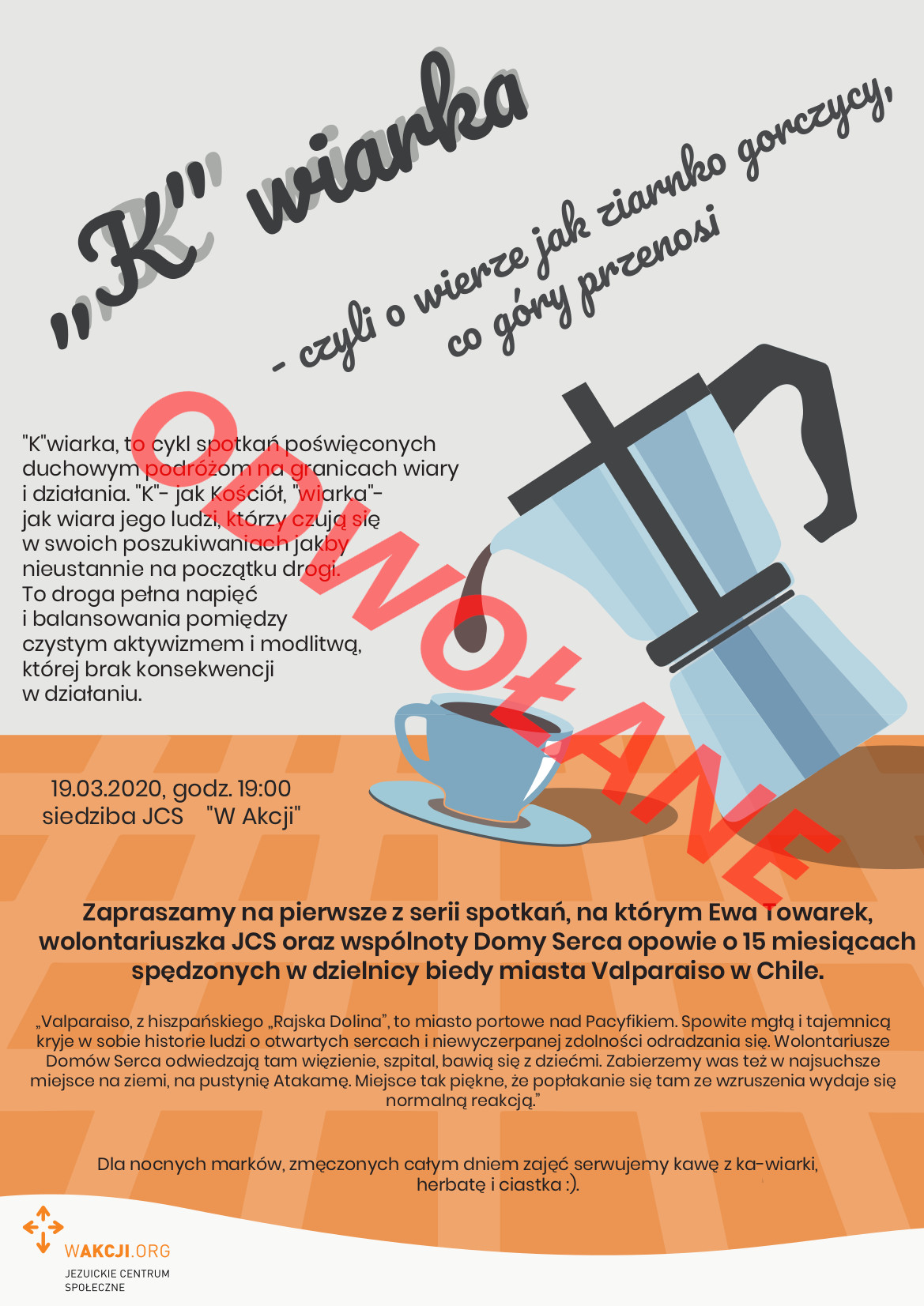Moi drodzy, trzymając się aktualnych zaleceń dotyczących naszego zdrowia i bezpieczeństwa odwołujemy czwartkowe spotkanie z p. Ewą Towarek. Nasza siedziba jest zamknięta do odwołania (przynajmniej do 25.03), co nie znaczy, że sam JCS zatrzymał swoją działalność. Wstępnie “K”wiarkę przeniesiemy na 23 lub 30 kwietnia. Ostateczny termin potwierdzimy w zależności od rozwoju sytuacji.