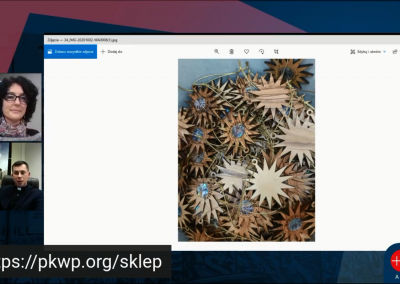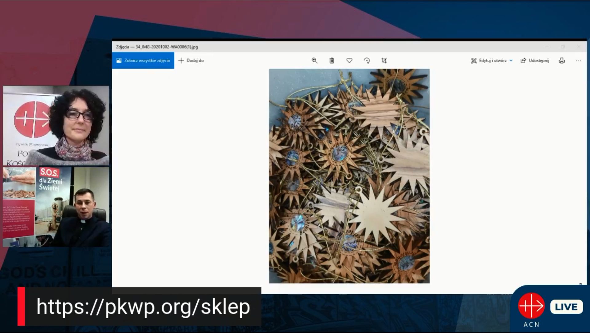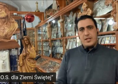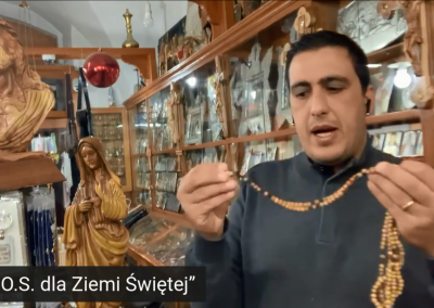 Zdjęcia w galerii: Mural na murze granicznym z Autonomią Palestyńską; Sklep rodziny Tabash w Betlejem; K. Waliszewska i ks. P. Antosiak w czasie transmisji online; Rony Tabash przed Bazyliką Narodzenia w Betlejem; Sklep i firma rodzinny Tabash od 1927. Dwadzieścia kilka rodzin pracuje aby wytwarzać pamiątki. Sklep mieści się naprzeciwko Bazyliki; Ratunkiem dla wszystkich jest sprzedaż wysyłkowa za granicę. Podobnie stara się działać jeszcze kilka innych sklepów z Betlejem. Są to firmy rodzin chrześcijańskich; Gwiazda betlejemska z drzewa oliwkowego i masy perłowej – do kupienia: https://pkwp.org/sklep
