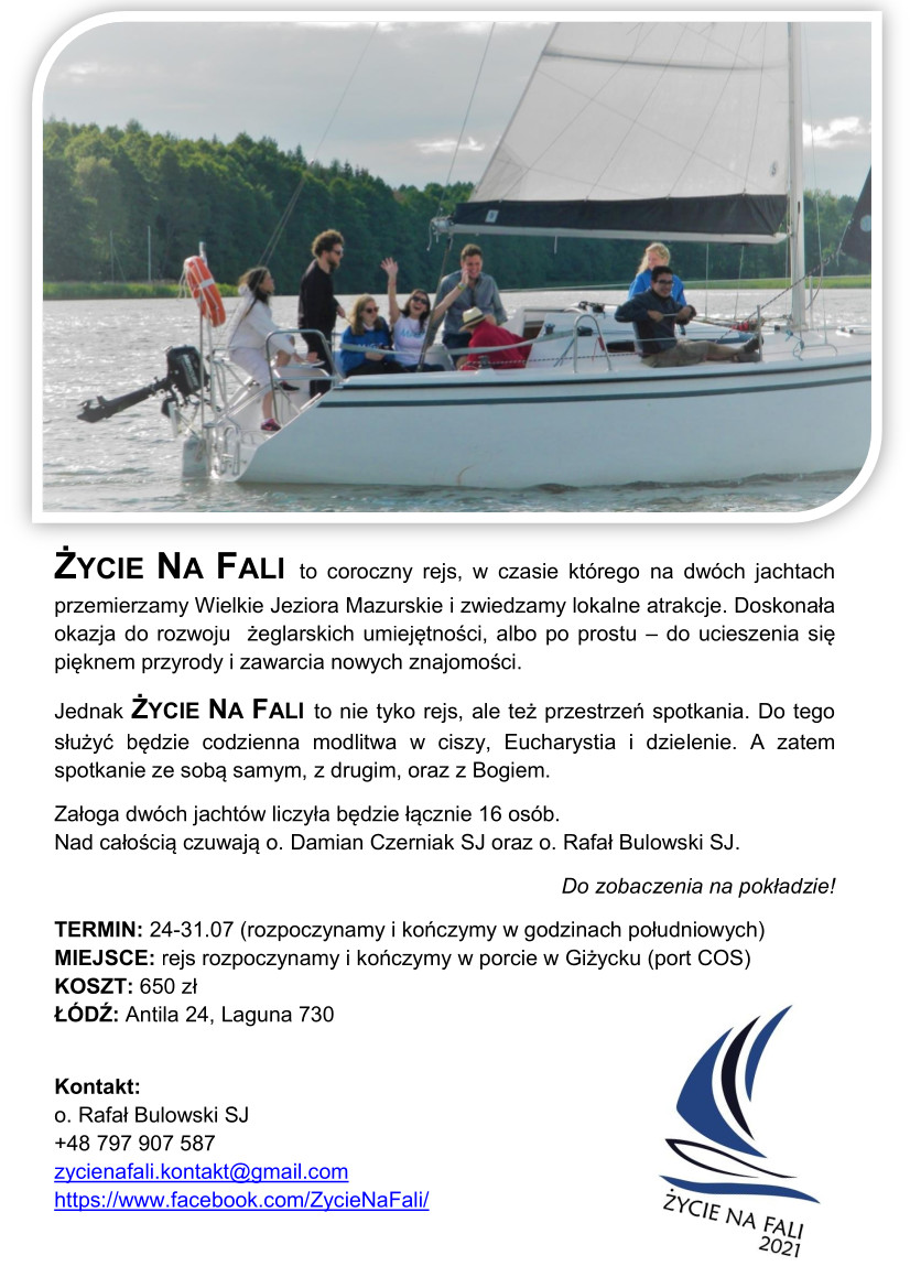Jednak ŻYCIE NA FALI to nie tylko rejs. Jest to też przestrzeń spotkania. Do tego służyć będzie codzienna modlitwa w ciszy, Eucharystia i dzielenie. A zatem spotkanie ze sobą samym – drugim – Bogiem