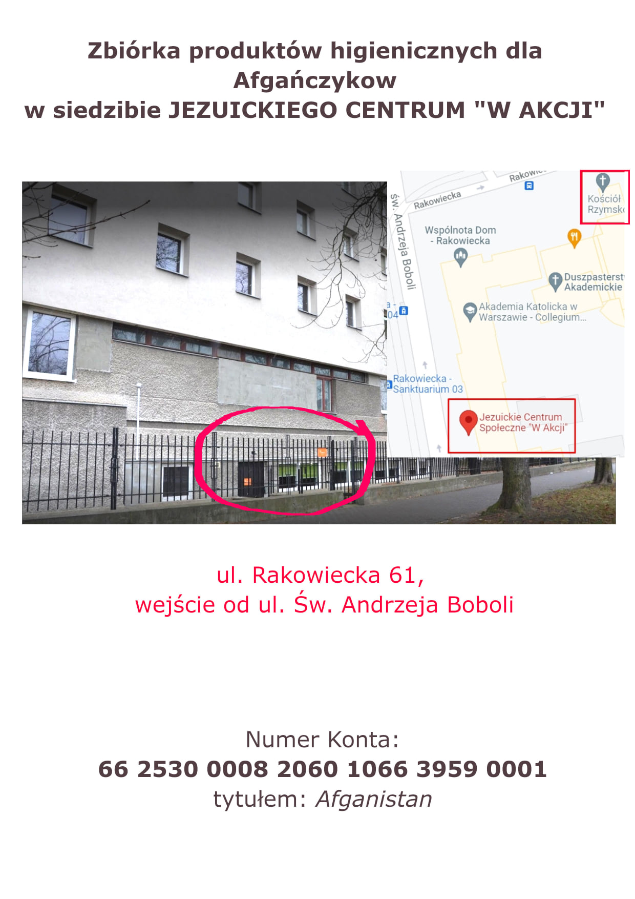 Od jutra do piątku (godz. 10-13:00 i 14-17:00) w Centrum JCS W Akcji przyjmujemy dary rzeczowe w postaci produktów higienicznych dla afgańskich uchodźców.