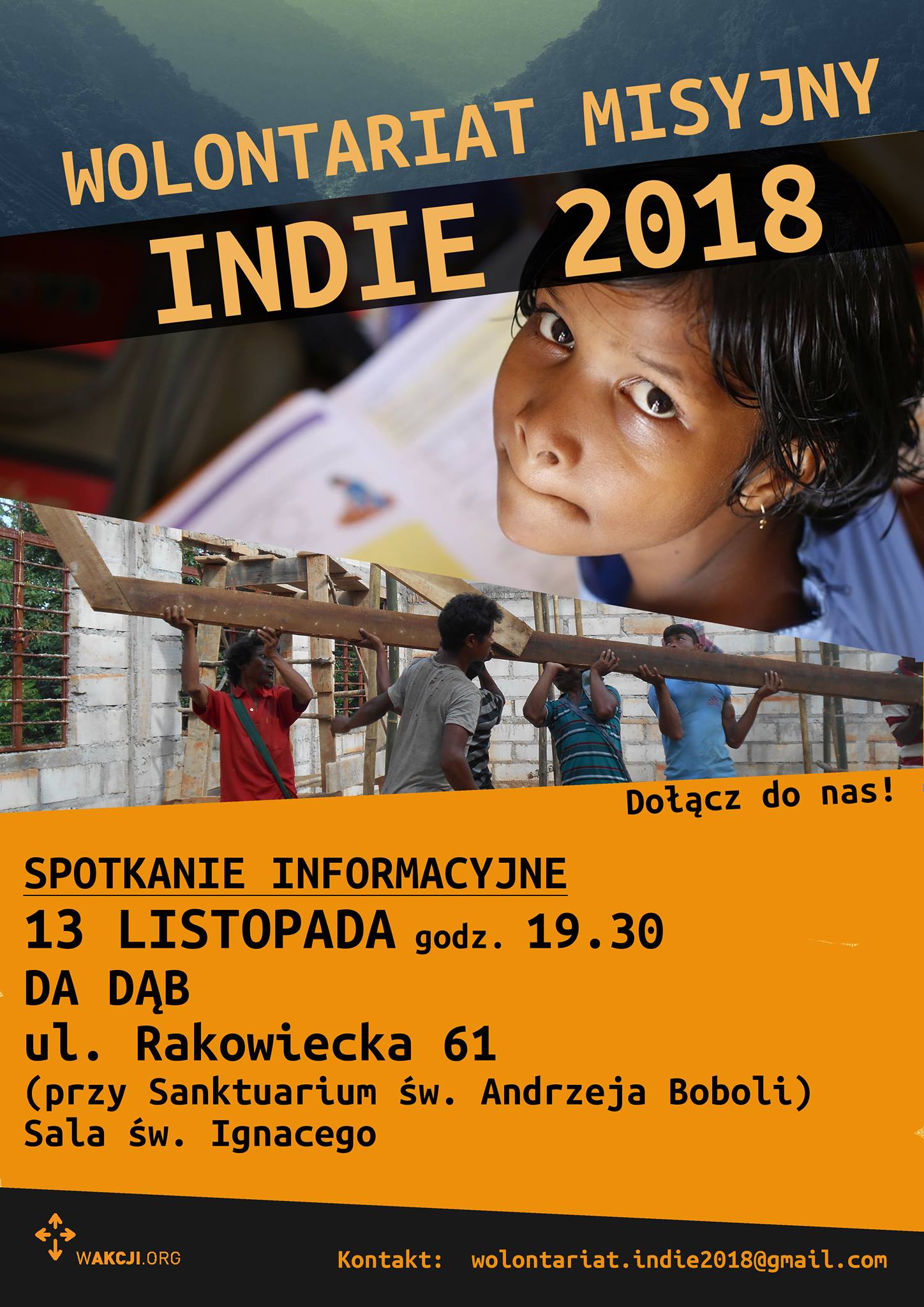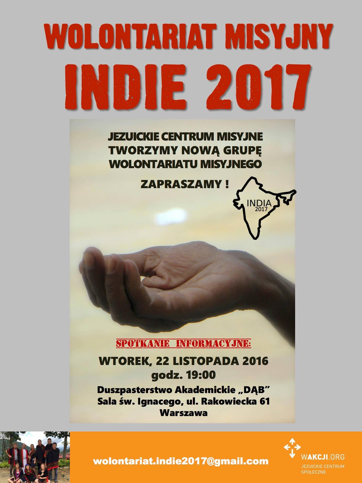 Jesteśmy grupą wolontariuszy, która z inicjatywy Jezuickiego Centrum Społecznego “W AKCJI” wyjedzie we wrześniu 2017 roku do Indii, aby wspomóc projekt budowy Kościoła dla chrześcijan w małej miejscowości w prowincji Meghalaya. Naszym dodatkowym zadaniem będzie nauczanie dzieci w miejscowych szkołach języka angielskiego.