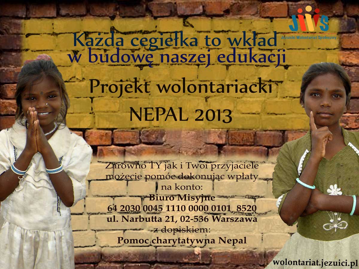 Celem naszej misji, która odbędzie się w sierpniu 2013r. jest pomoc przy budowie placówki edukacyjnej dla najbiedniejszych dzieci żyjących w Nepalu (Deonia, Jhapa). Wiele nepalskich dzieci jest sierotami, nie mającymi szans na godne życie i edukację. W Nepalu bardzo często dzieci nie mają możliwości nauki w odpowiednich warunkach. Z powodu biedy wykorzystywane są do pracy. Dlatego budowa placówki edukacyjnej może w sposób znaczący przyczynić się do polepszenia sytuacji życiowej społeczności lokalnej poprzez stworzenie dobrych warunków do edukacji. Wolontariat jest realizowany przy współpracy z dyrektorem misji jezuickiej w Nepalu – o.Paulem Chemparthy SJ.