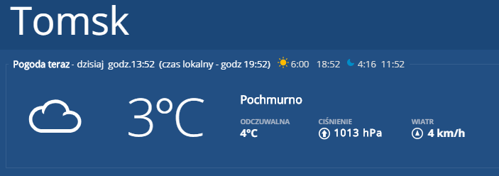 W Tomsku aktualna temperatura to 3°C ;o, ale nie martwcie się! W lipcu pogoda będzie podobna do tej w Polsce, a może będzie nawet odrobinę cieplej, kto wie ;)?