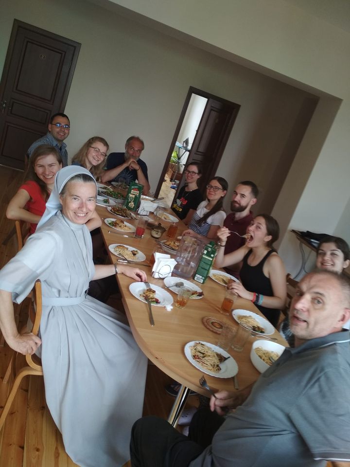 Obiad u naszych Jezuitów, dziś ostatni dzień w całym gronie. Już podzieliliśmy się na dwie ekipy. Piątka z nas będzie współpracować z dziećmi, a pozostała czwórka z niespelnosprawnymi.