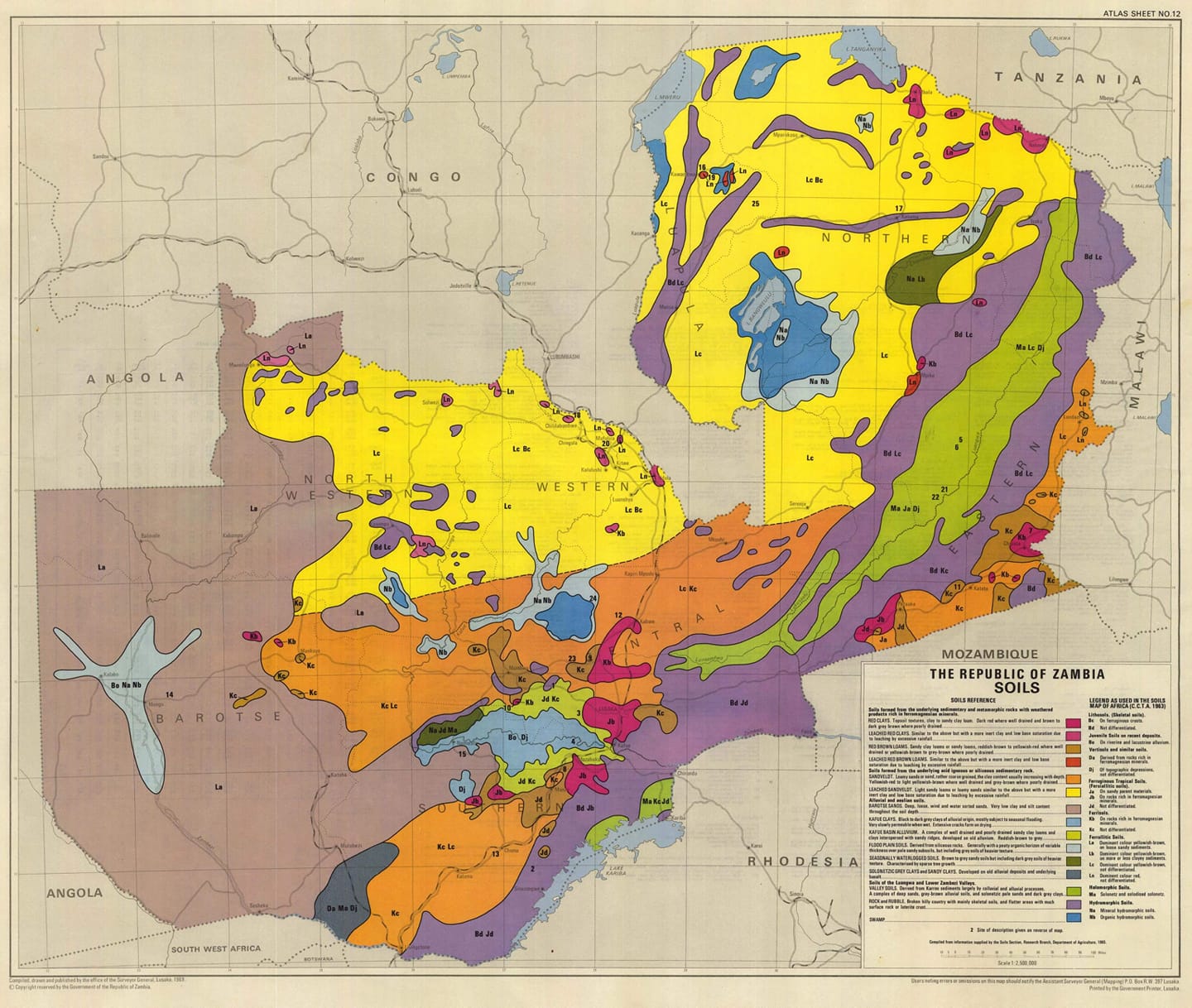 – Piaski Kalahari i równinę zalewową Zambezi na zachodzie (czyli ten turkusowy, czyli z trochę z zielonego i niebieskiego koloru…). Gleby Piasków Kalahari mają niewielki potencjał rolniczy i są głównie zalesione.